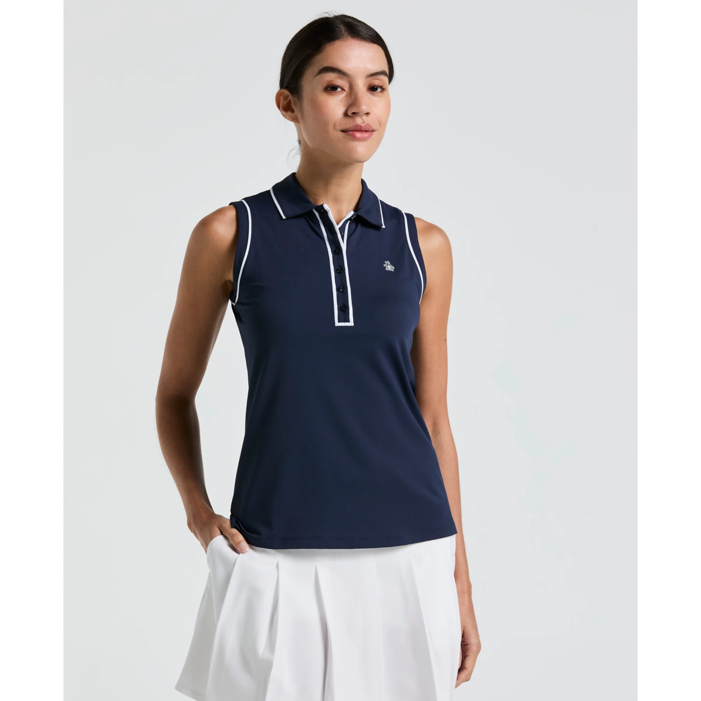 Perfect for the golf course and beyond, this Original Penguin women's skort combines the cute look of a skirt with the practicality of shorts. It's made from a comfortable twill fabric enhanced with stretch for ease of movement. Moisture-wicking technology helps you stay cool and dry. The micro pleated design and colourblock detail add eye-catching style, while the built-in undershorts offer greater coverage and confidence. A superb choice, this skort is made with recycled polyester.